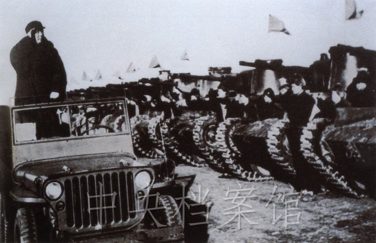 紀(jì)錄片:(群眾呼聲)中國人民萬歲!(紀(jì)錄片解說)檢閱開始了。東北野戰(zhàn)軍參謀長劉亞樓將軍,向毛主席報告受檢閱的部隊全部到齊。坦克塔上飄揚著紅旗,坦克手精神百倍,向著自己的領(lǐng)袖敬禮。